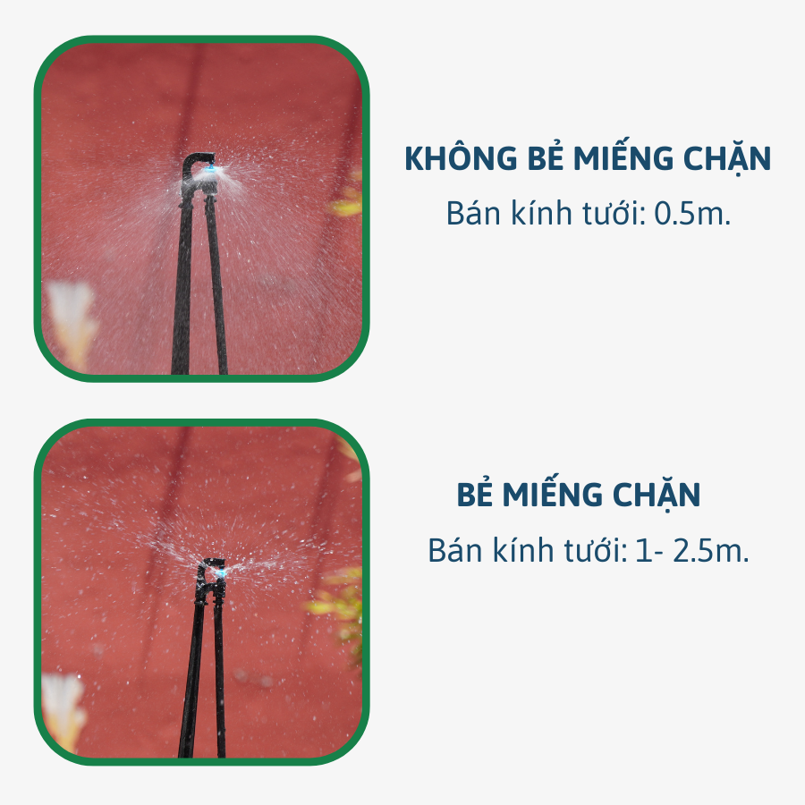 - Bẻ miếng chặn bán kính tưới có thể đạt 0.5 – 2.5m