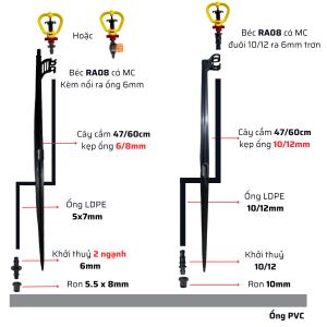 - RA08 có 2 loại tưới phủ và có miếng chặn: Tưới phủ ( 150-220L, 220-280L) , Tưới gốc ( 60L, 90L, 150L, 220L).