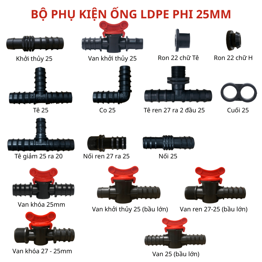 - Dùng trong hệ thống tưới cây, tưới phun mưa dùng ống LDPE 25.